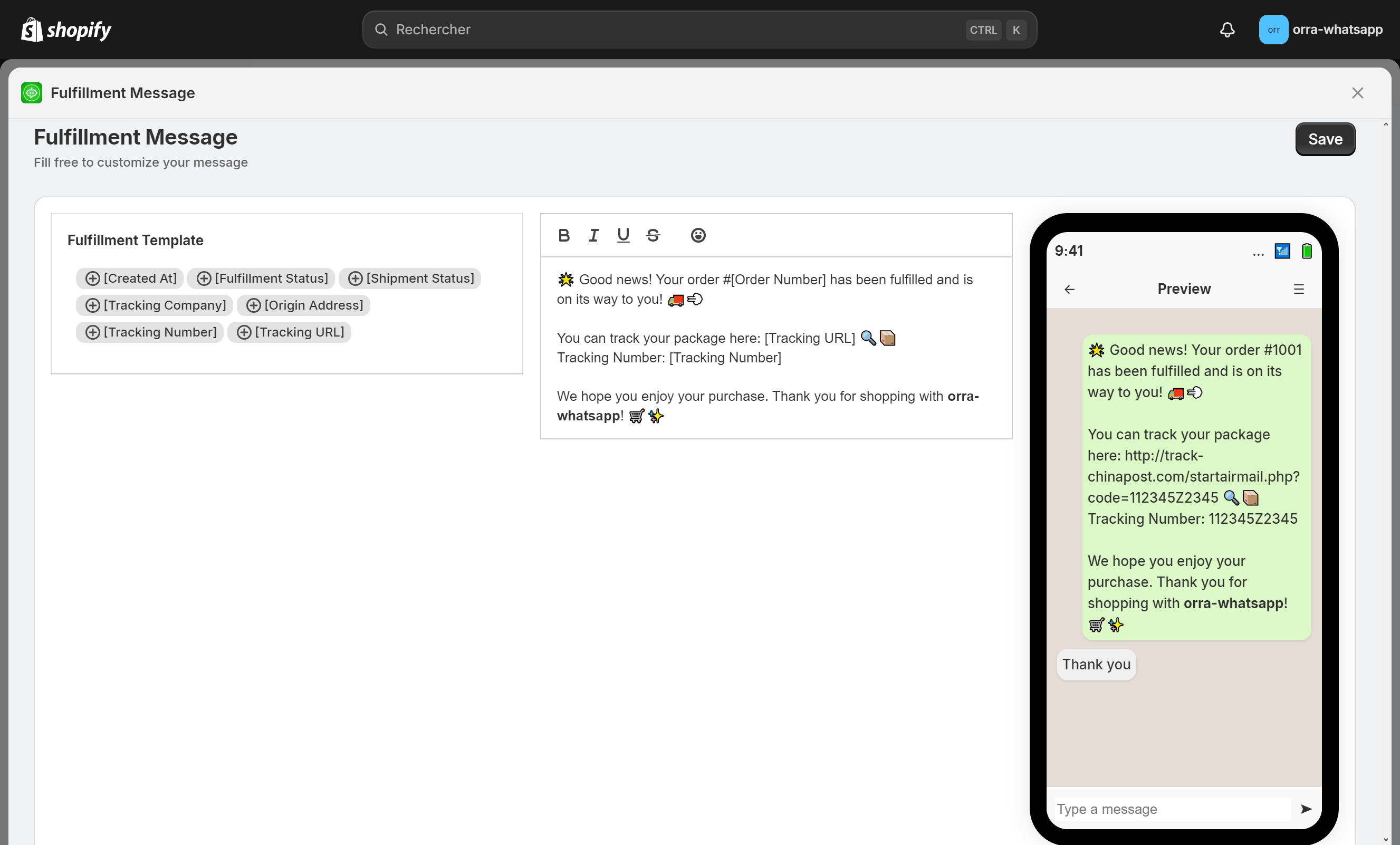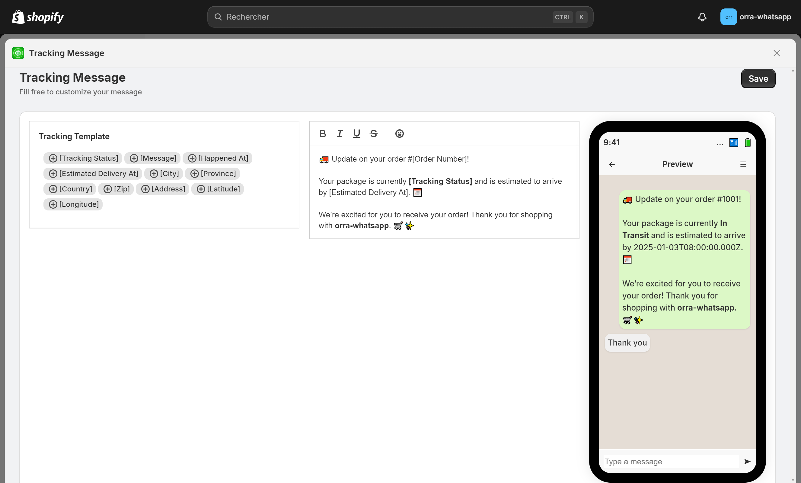 Orra is a Shopify app designed to automate customer communication through WhatsApp notifications. It streamlines order management by sending automatic messages for order placement, fulfillment, and tracking.