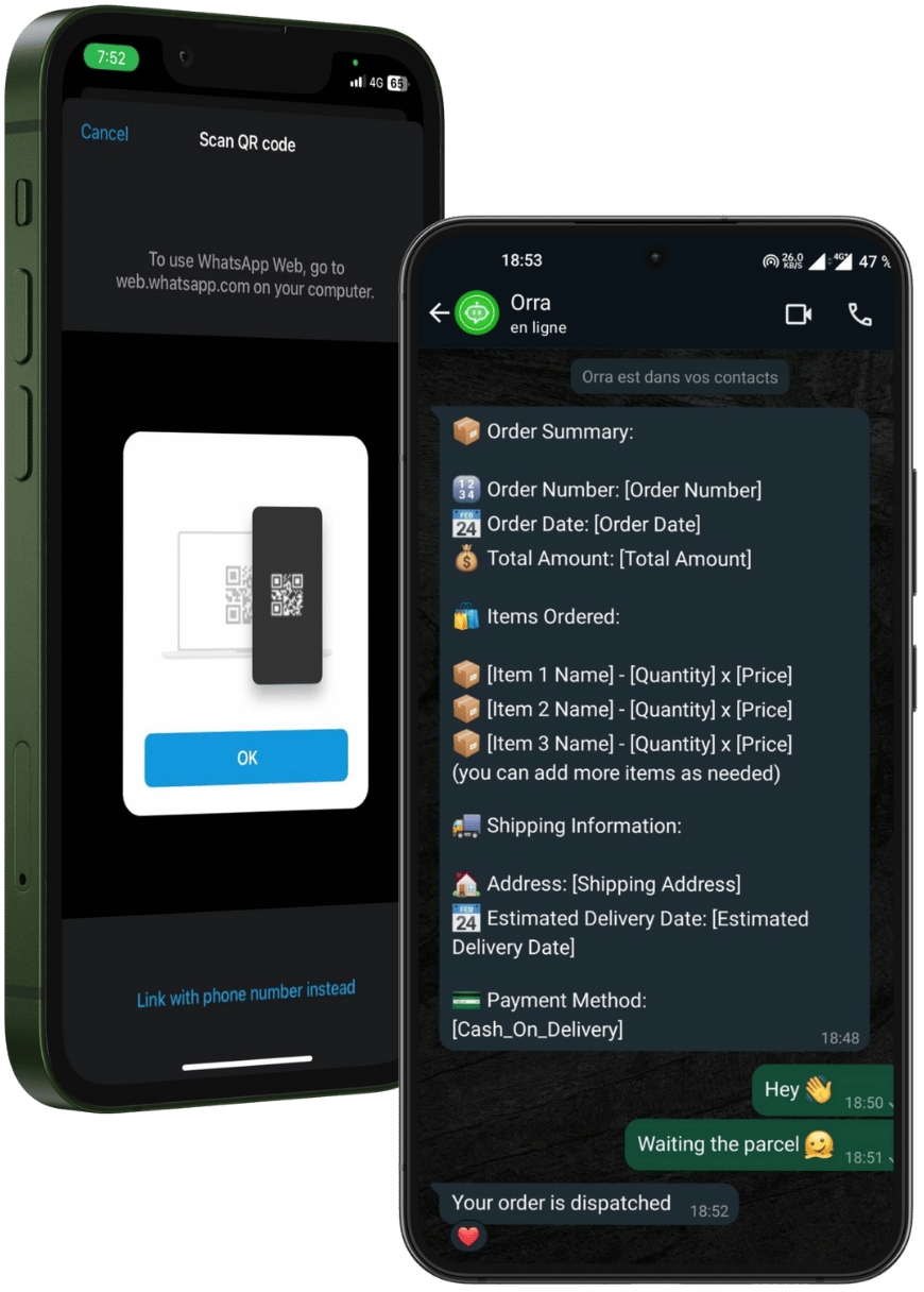 With Orra, you can connect your own WhatsApp account, allowing messages to be sent directly from your personal or business WhatsApp number. This ensures that all communication remains consistent and personal, directly from you to your customers.
